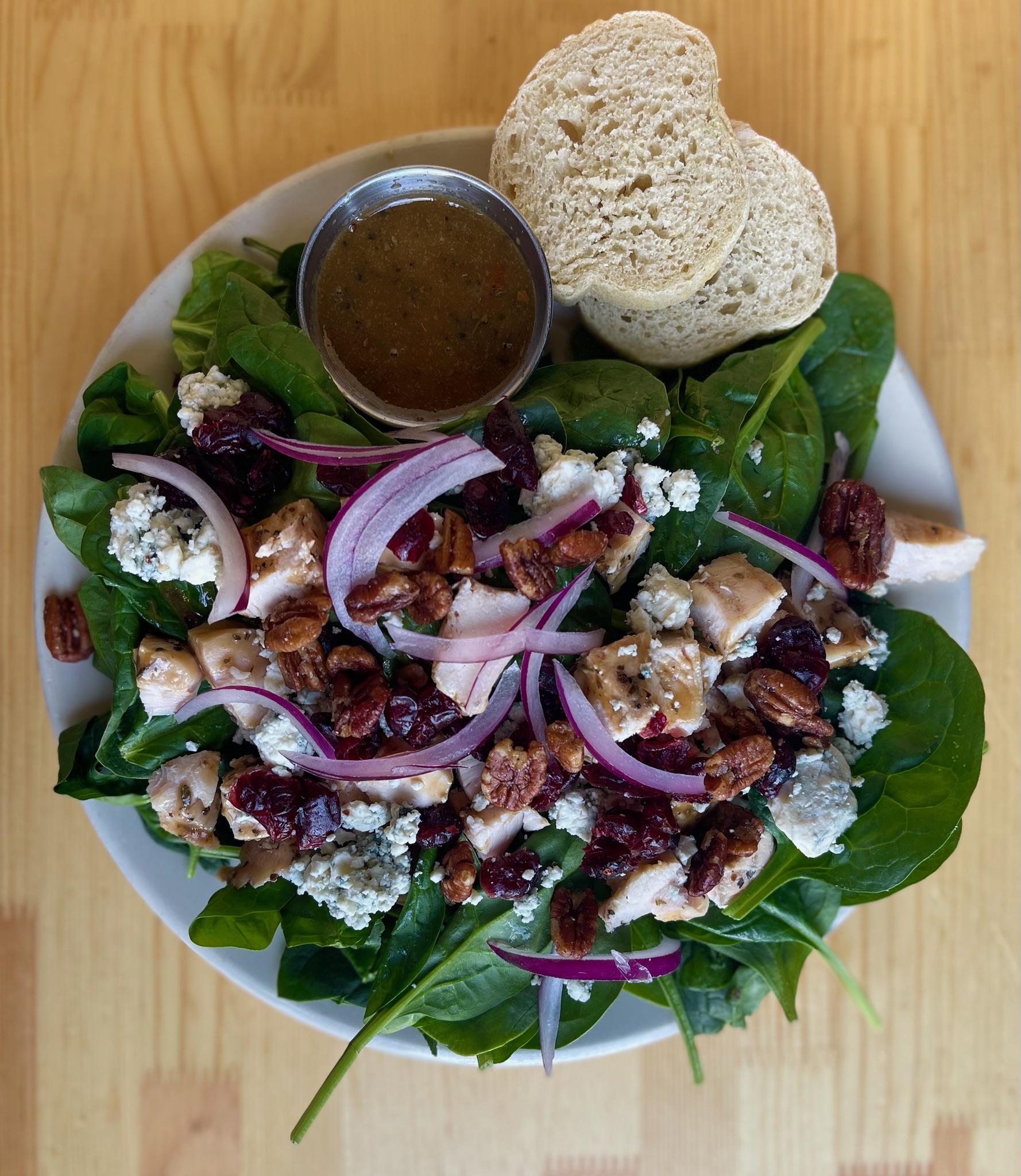 Warm Grilled chicken breast, dried cranberries, sweet and spicy pecans, blue cheese, and red onion on Fresh Spinach with Balsamic Vinaigrette