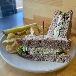 Made with red onion, capers, lemon zest, olive oil and herbs, on sour cream dill bread with lettuce and tomato